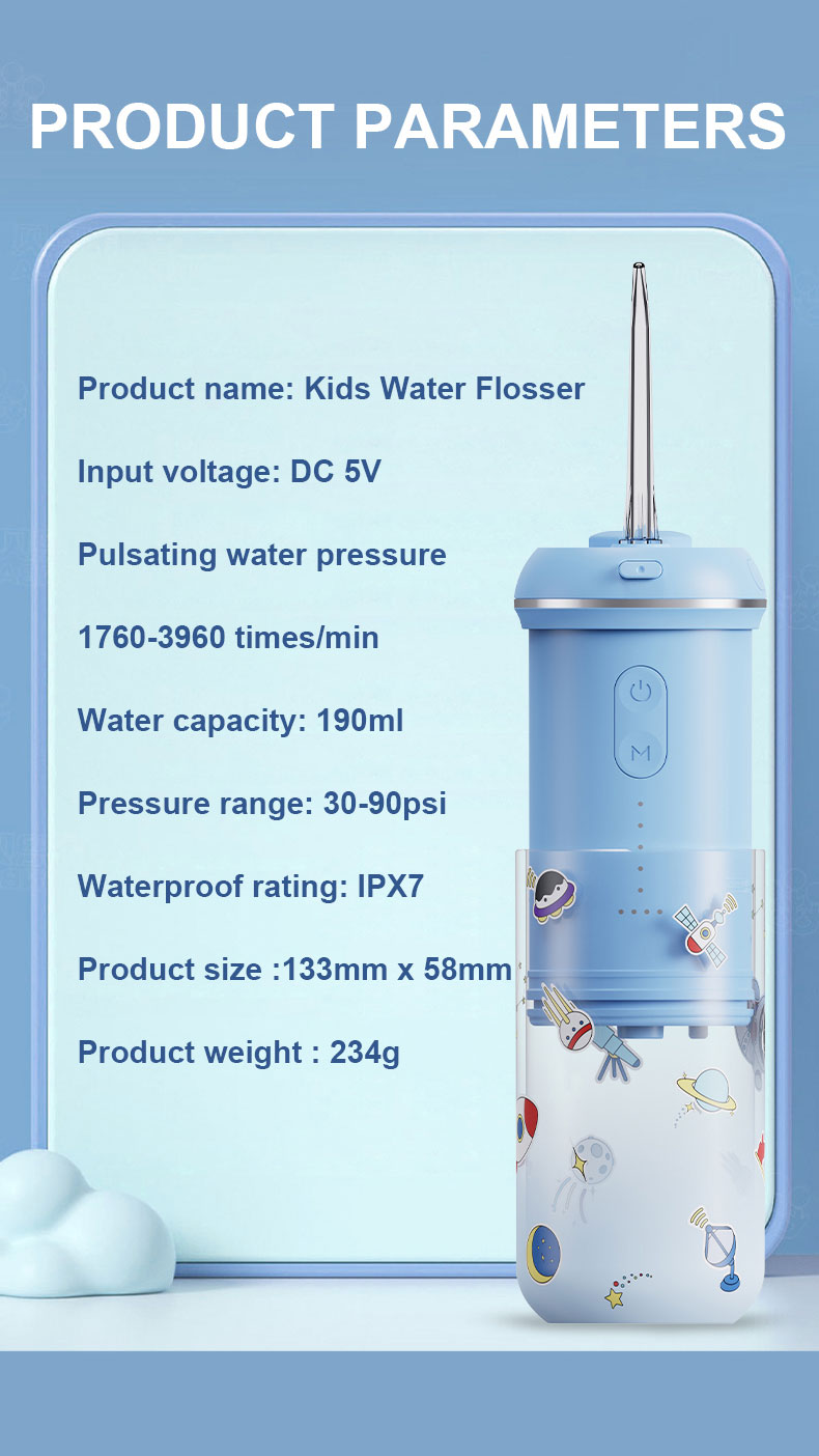 - Easy to Use and Hold for Children: This water dental flosser is designed to fit children's palms, has a smart memory function and simple one-button operation,the back has a concave and convex anti-slip design.The included cute stickers allow kids to customize and decorate the floss with their favorite characters. The water tank capacity is 190 ml, so you don't need to add water frequently during use.