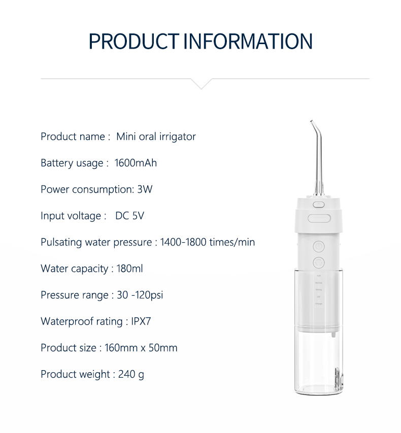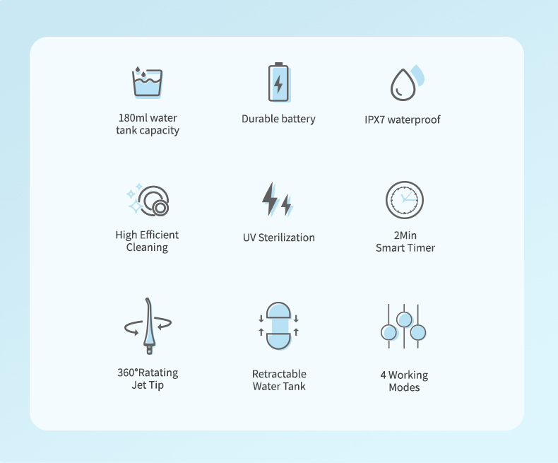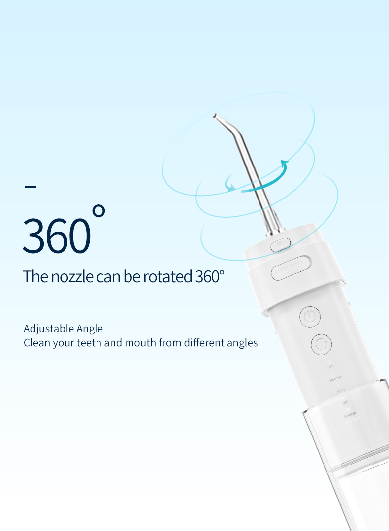 Limpeza profunda com forte pressão: o fio dental adota a mais recente técnica de pulso para oferecer 4 modos com uma faixa de pressão entre 30-90 Psi e frequência de pulso de 1400-1800 vezes/minuto, para oferecer água de alta intensidade que limpa 99,99% da tensão dos dentes, projetado especificamente para periodontite e aparelhos ortodônticos.