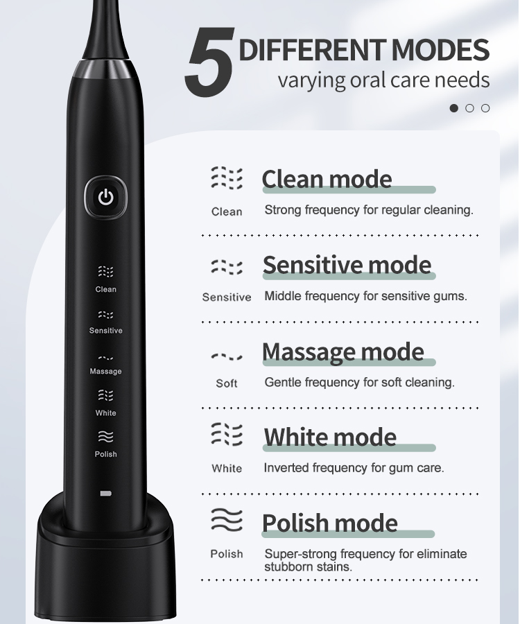 - 5 MODOS DE ESCOVAÇÃO DE ALTO DESEMPENHO - Limpo (suave), Branqueamento (forte), Polimento (forte frequência de inversão), Mais suave (suave frequência de inversão) e Sensível (suave) para se adequar a diferentes condições dos dentes e gengivas, para que você possa escolher diferentes modos de acordo com suas preferências e recomendações do dentista.